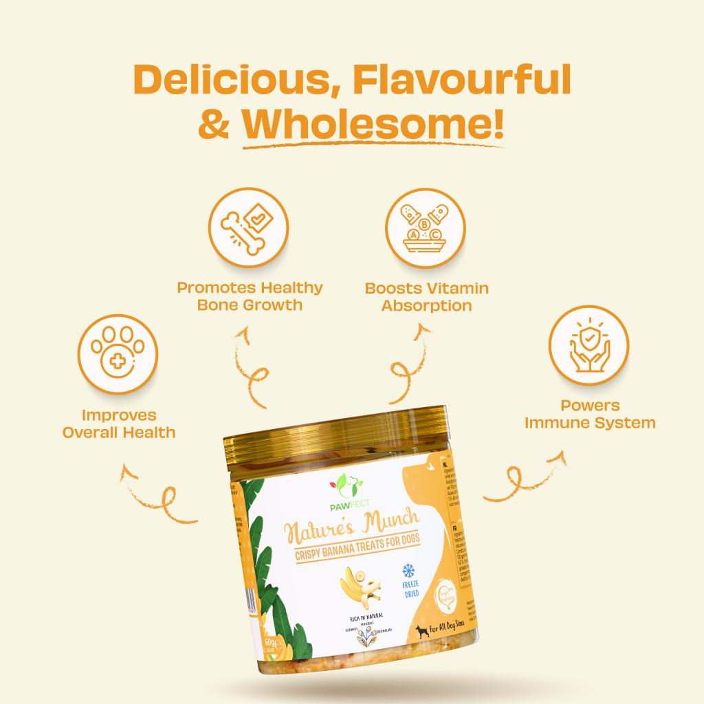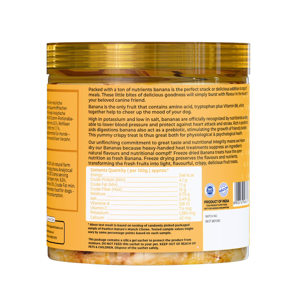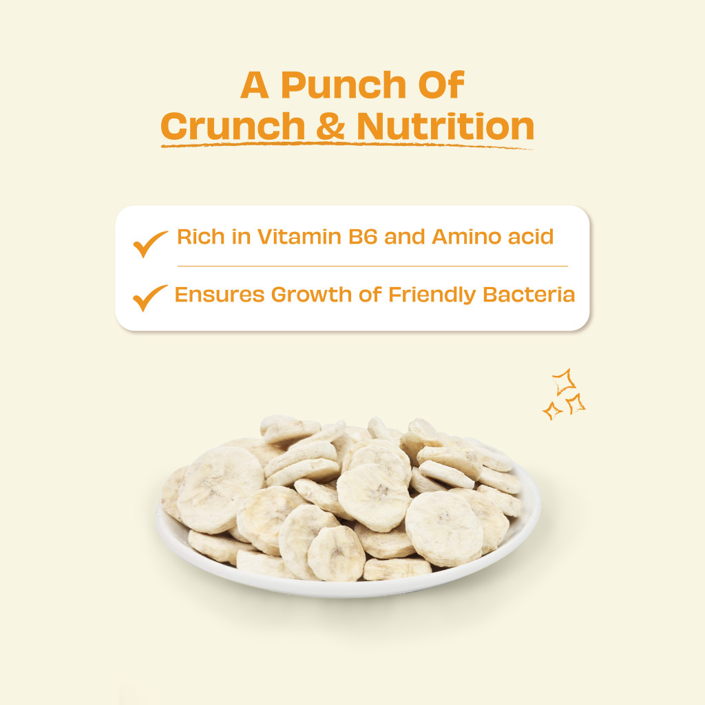 100%-ban természetes, emberi fogyasztásra alkalmas banánból készült jutalomfalat, mely a legkíméletesebb módon, fagyasztva szárítással készül. Ásványi anyagokban és esszenciális vitaminokban gazdag, tápanyagdús csemege.